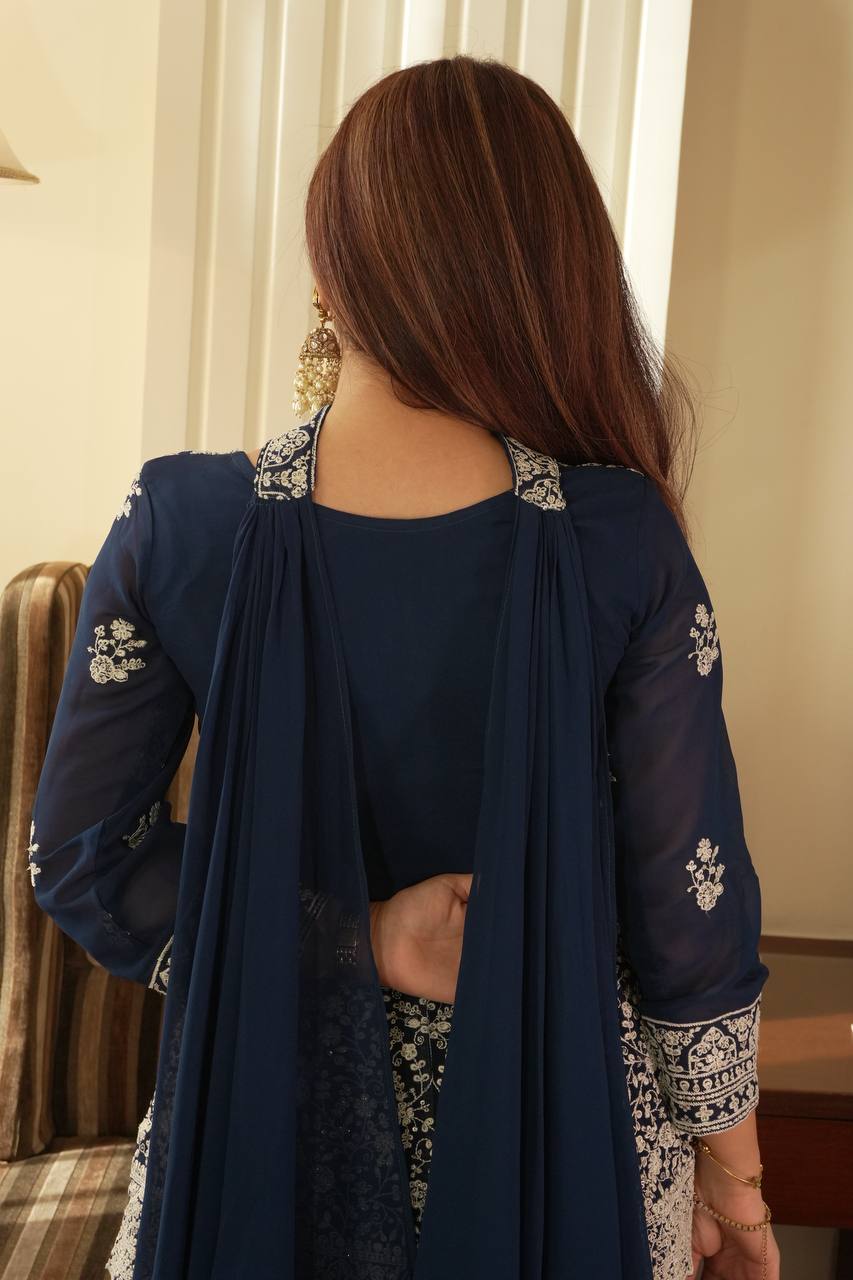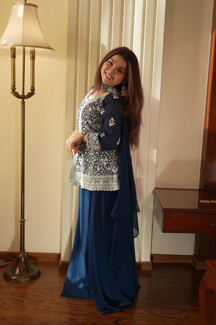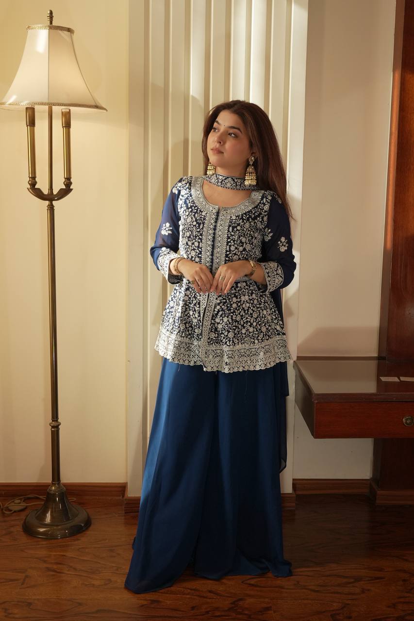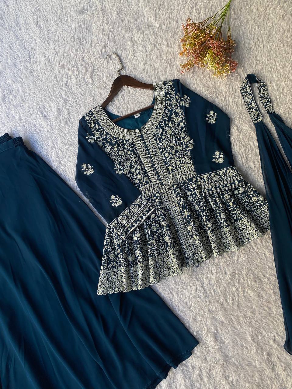 Turn heads with this viral embroidered peplum top set, beautifully designed in flowy georgette and showcased in real modeling for a true premium look. This elegant outfit blends modern peplum styling with traditional embroidery, making it perfect for festive occasions, parties, and special celebrations.