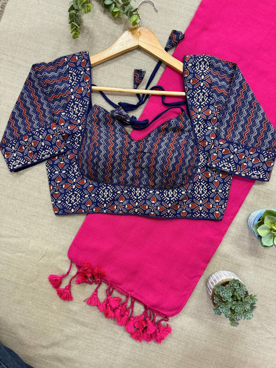 Elevate your wardrobe with this elegant Khadi Cotton Saree, paired with a beautifully crafted Pure Ajrakh Cotton Blouse. Perfectly blending tradition with modern comfort, this ensemble is designed to make you look effortlessly graceful.
