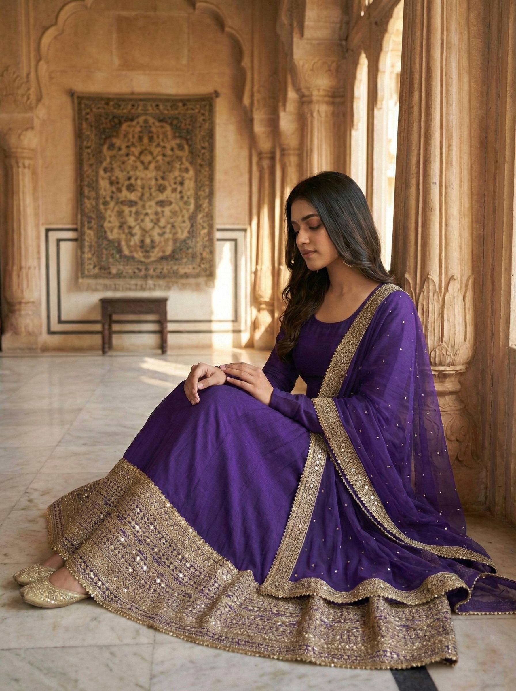 Make a grand entrance with this luxurious Anarkali Gown Set, designed with rich Roman silk and detailed coding sequins work. With its flowing 3.70-meter flair and elegant full-sleeve silhouette, this outfit delivers the perfect royal festive and wedding look.