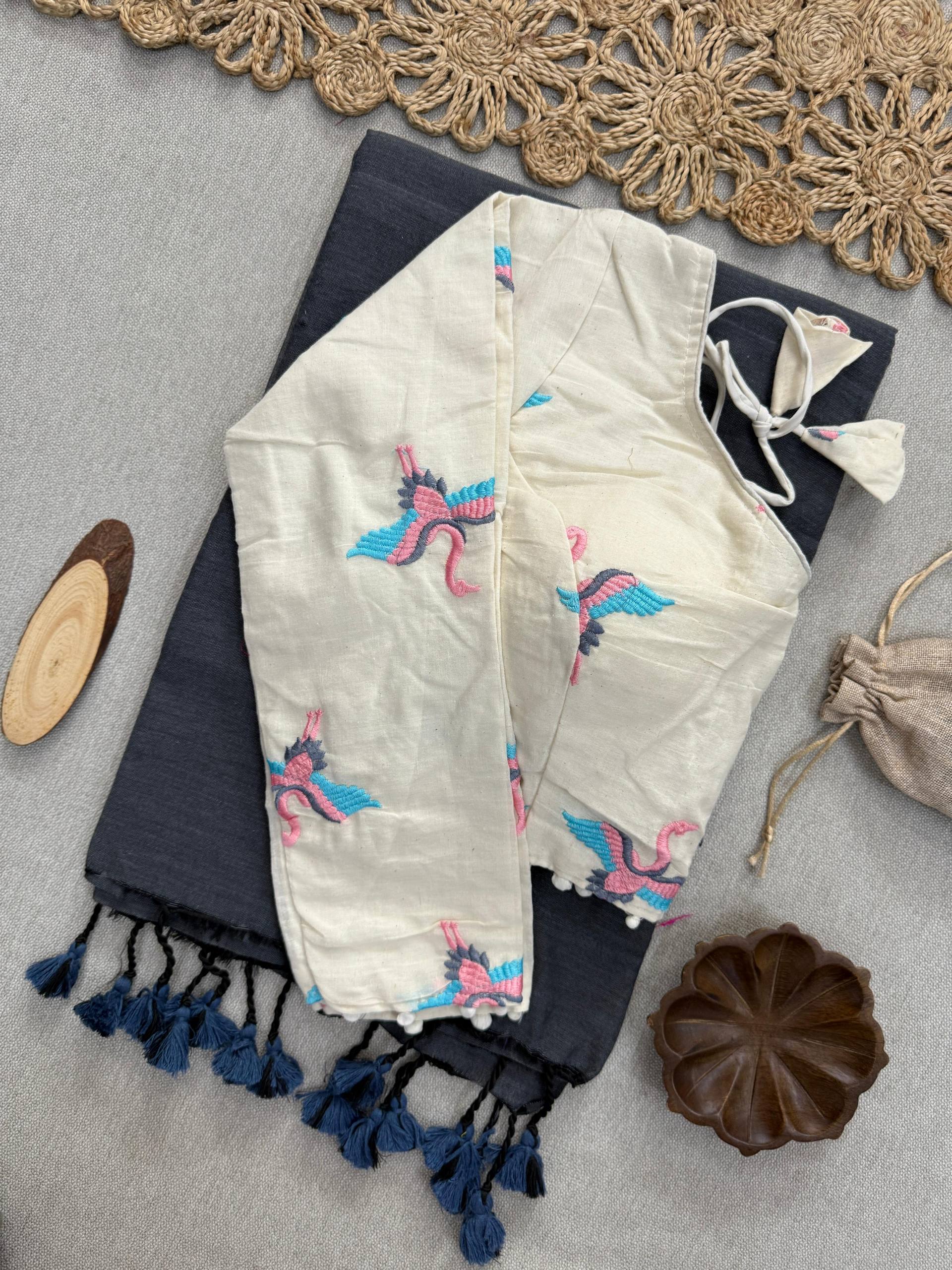 This saree blends the richness of khadi cotton with a statement embroidered blouse, making it a timeless choice for festive gatherings, traditional functions, or elegant daywear. 🌺