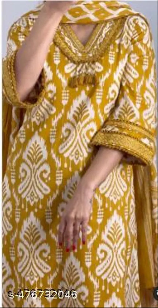 Yellow Ikkat Straight Printed V-Neck Kurti Pant with Dupatta Set – Timeless Elegance & Comfort